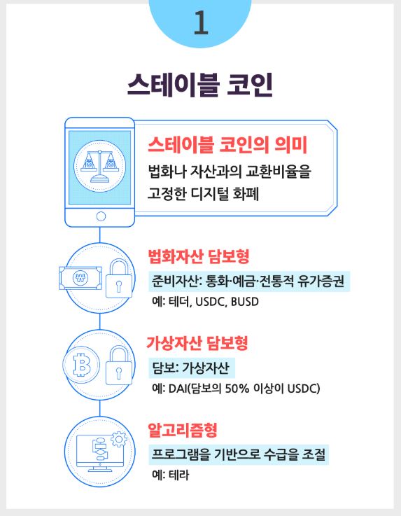 달러, 유로 같은 실제 화폐나 금, 국채 같은 자산에 가치를 연동시켜, 가격이 1:1로 고정되도록 설계된 코인입니다.