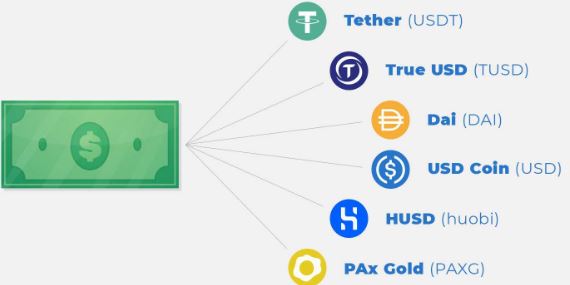 예를 들어 USDT(테더) 나USD코인은 달러와 같은 가치를 가지며, 언제든 1달러와 교환할 수 있습니다